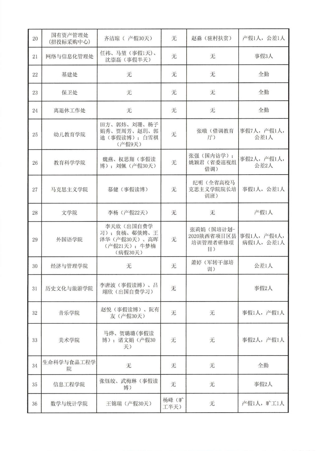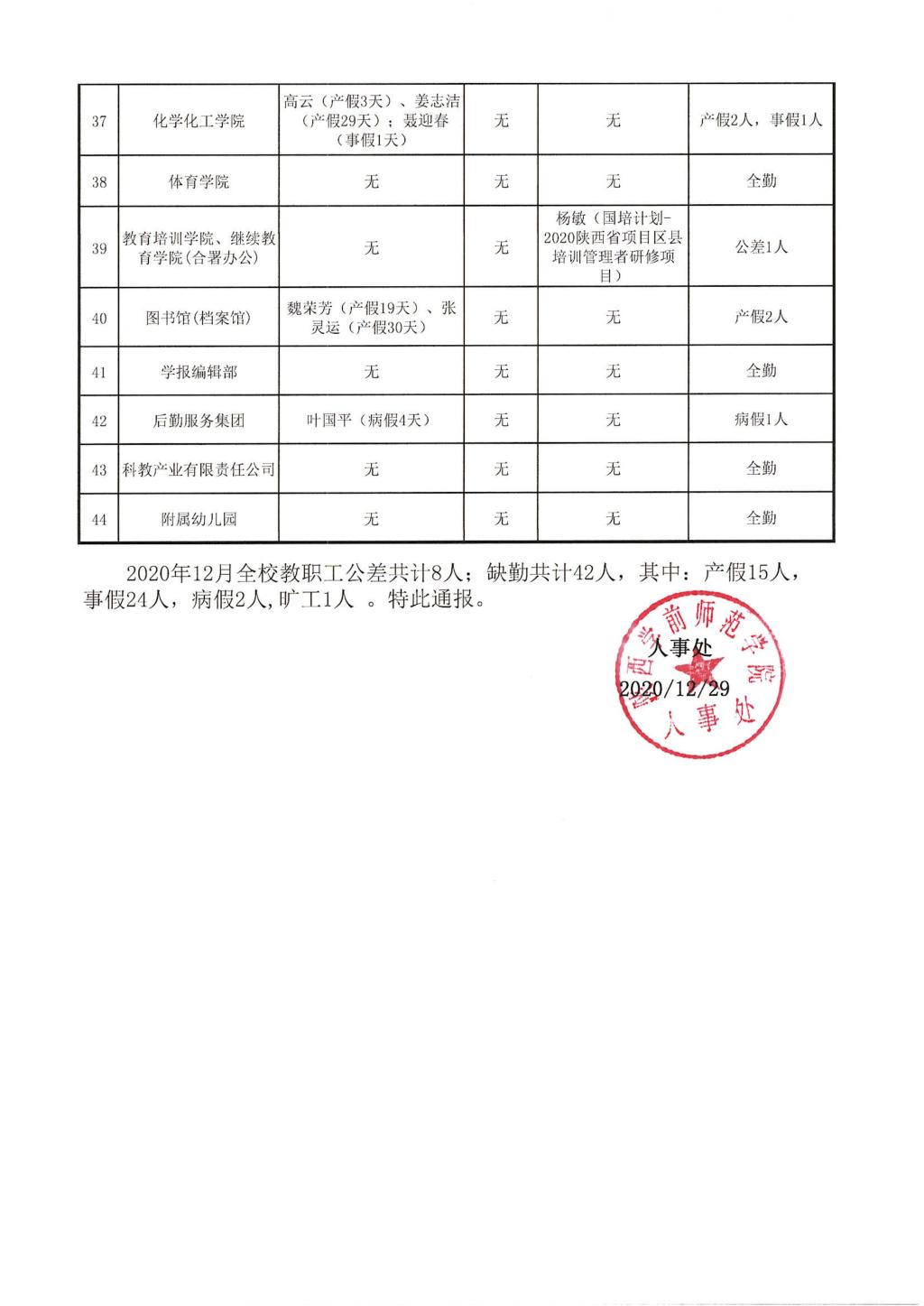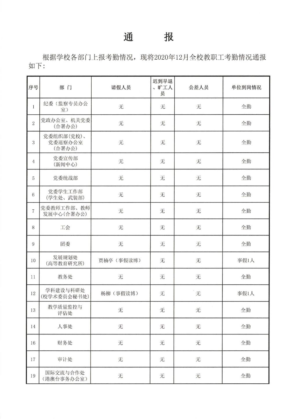 2020年12月教职工考勤通报