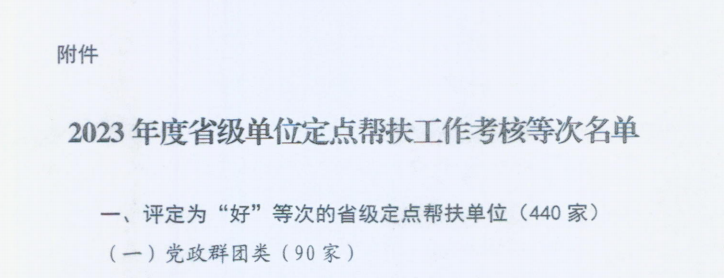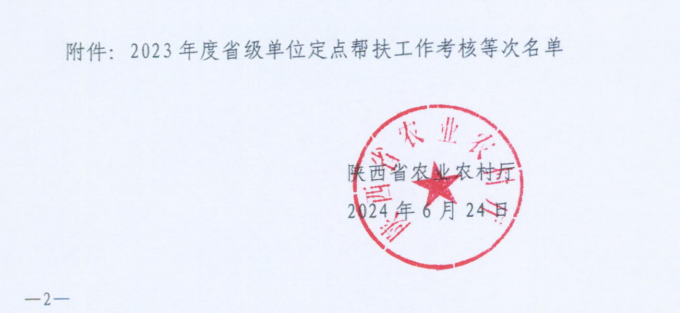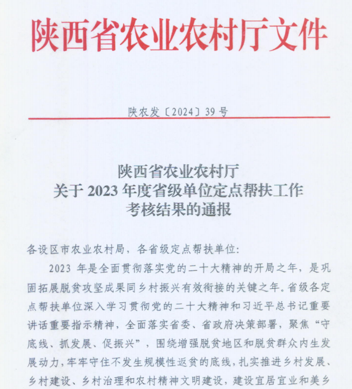 近日,陕西省农业农村厅下发了《陕西省农业农村厅关于2023年度省级单位定点帮扶工作考核结果的通报》(陕农发[2024]39号),公布了2023年度省级单位乡村振兴帮扶工作考核结果。云博yunbo(中国)2023年度定点帮扶工作考核获评最高等次“好”。