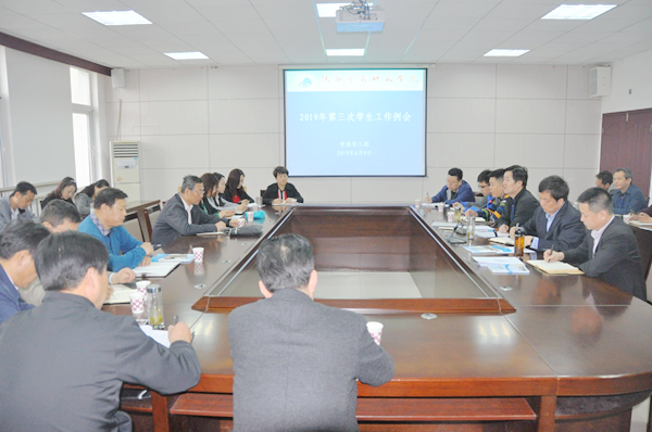 2019年4月9日上午,2019年第三次学生工作例会在学校行政楼第四会议室召开。学工部、团委等部门负责人及各院(系)党总支书记、副书记参加了会议;校党委副书记栾高明出席本次会议,会议由学工部部长史保怀主持。