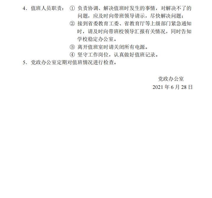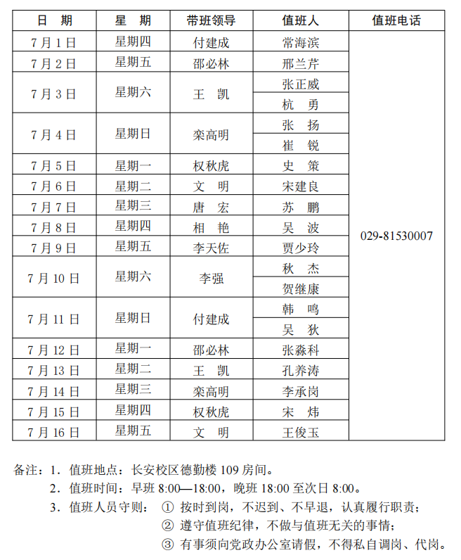 陕西学前师范学院长安校区值班表(2021年7月1日—7月16日)