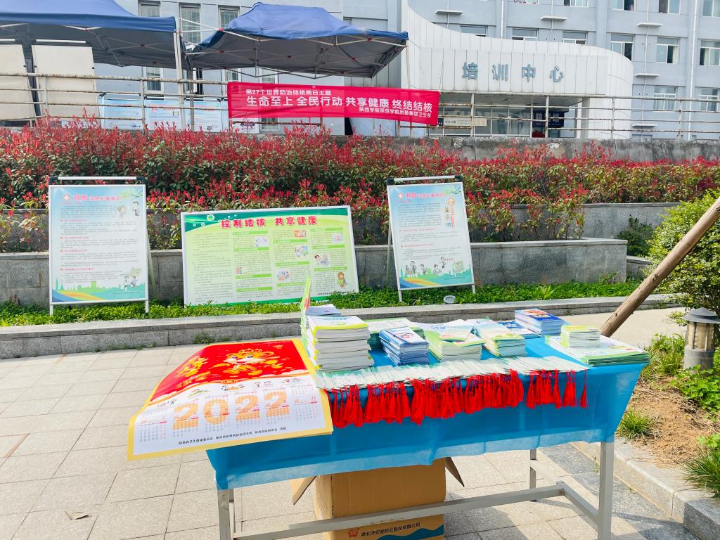 宣传现场,摆放结核病等呼吸道传染病的各种宣传资料及狂犬病、出血热、艾滋病等宣传资料,悬挂“生命至上、全民行动、共享健康 终结结核”大型横幅,摆放宣传展板,接受学生现场咨询,同时在学生工作群里发放关于“结核病科普微视频、2022功夫结核”等结核病防治科普知识,利用多种形式的宣传活动,使每一位同学了解结核病防治的基本知识。