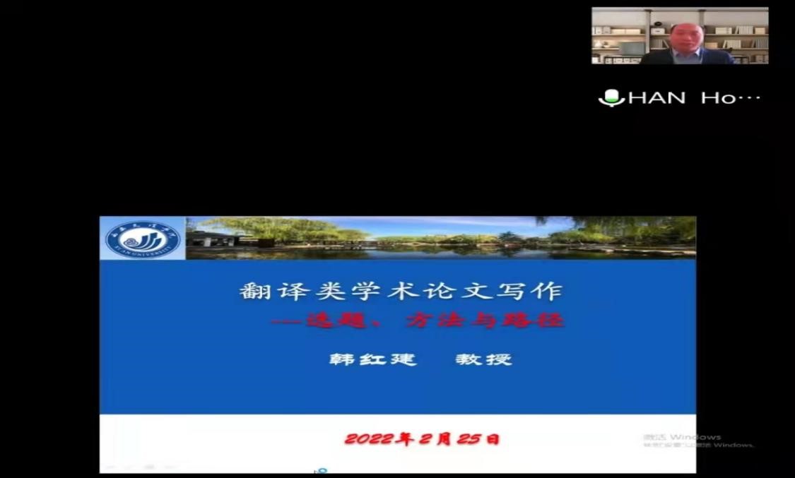 西安文理学院韩红建教授报告的题目是“翻译类学术论文写作:选题、方法与路径”。 讲座伊始,韩教授概要讲解了学术论文的类型和撰写过程。接下来,他详细介绍了翻译研究的内容与选题,他指出选题的基础要将研究兴趣与自身知识储备结合起来,选题原则应遵循创新性与价值性原则。他结合自身教学与学习经验,强调大量阅读文献的重要性,任何好的选题都不是凭空而来,而是从平时阅读、思考、讨论及实践观察中得来的。随后,韩教授从思辨类、实证类、综述类、书评类这四大类论文类型一一为大家分析了学术论文的结构和行文范式。最后,他对学术论文的投稿与发表相关问题给予简要说明,并总结说科研是教师职称晋升和待遇提升不得不做的事,与其“不得不”,不如积极面对。他希望青年教师正确认识教学与科研的关系,要坚持教学和科研并举、理论联系实际,树立钻研精神,提高研究问题的能力和水平。