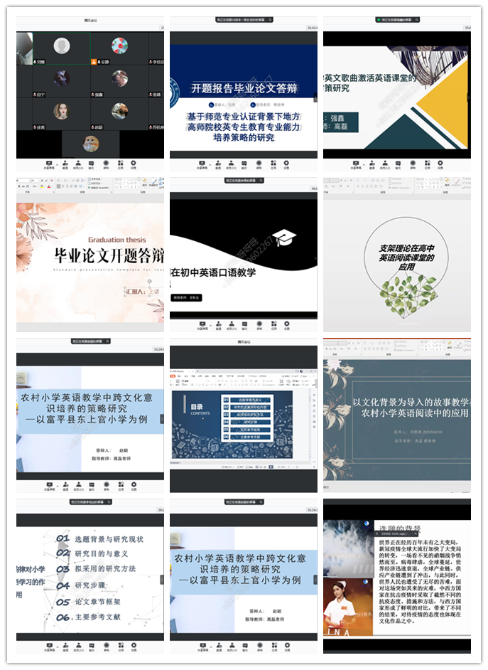 本届毕业生选题涉及语言学、文学、跨文化交际、翻译、教学法五个方面。线上答辩过程分为毕业生陈述、评审提问和小组评议三个环节。首先,毕业生对论文选题的背景、意义、研究现状、论文框架和研究思路与方法等方面进行阐述;其次,评审老师针对毕业生论文选题和陈述内容进行提问;第三,评审老师从论文题目、论文结构、研究方法,论文格式等方面指出论文的优点与不足,并提出详细和中肯的修改建议。答辩结束后,每位同学将根据评委老师的修改意见修改开题报告并着手开始论文撰写。
