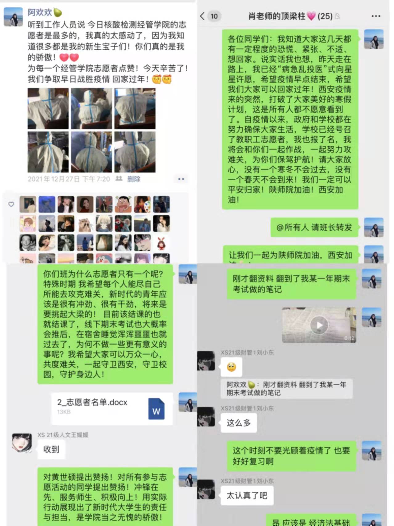 模范带头,勇敢担当。面对突如其来的疫情,经济与管理学院学生党支部、团总支、学生会号召全体学生齐心协力,共抗疫情,组建经济与管理学院同心战“疫”青年志愿者先锋队,积极参与学校长安校区核酸检测志愿服务工作,为疫情防控工作贡献力量,也彰显了经管学子的责任担当。我院党员干部主动作为,积极参与学校第一批、第二批、第三批疫情防控志愿者征集,参与隔离考点监考、研究生考生信息摸排、雁塔校区核酸检测等多项志愿服务工作,在关键时刻彰显了党员干部的模范带头作用。