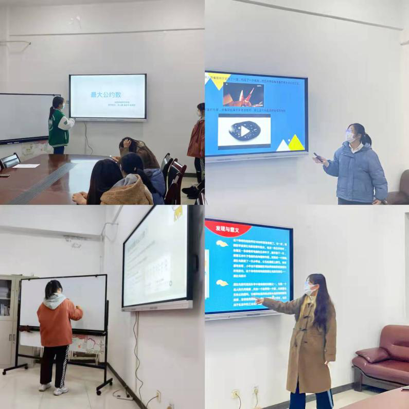 本次活动旨在通过各个不同主题的分享讨论,拓展学生的知识领域,改进学生的数学思维方式,以此提高数学与统计学院学生的专业自信心,激发学生对数学专业课学习的积极性。同学们踊跃参与、积极发言,活动现场洋溢着同学们浓浓的数学热情。第一组同学以“最大公约数”拉开汇报序幕,系统讲述了最大公约数的历史背景与计算方法。一张纸旋转再旋转,最后重合在一起,浪漫的“莫比乌斯环”就此诞生,它可以出现在建筑或戒指设计上,也可以是我们身边任何的物品,第二组同学将我们从理论带到了现实。第三组的“杨辉三角”带领同学们游走在数字规律的海洋中,使同学们认识到它是二项式系数在三角形中的一种几何排列,接下来,各小组依次进行了庞加莱猜想、费马大定理、斐波那契数列、素数猜想等主题的讲解,最终,以李茜同学为代表的“素数猜想”小组获得了老师以及全体同学的肯定,取得了第一名的好成绩。