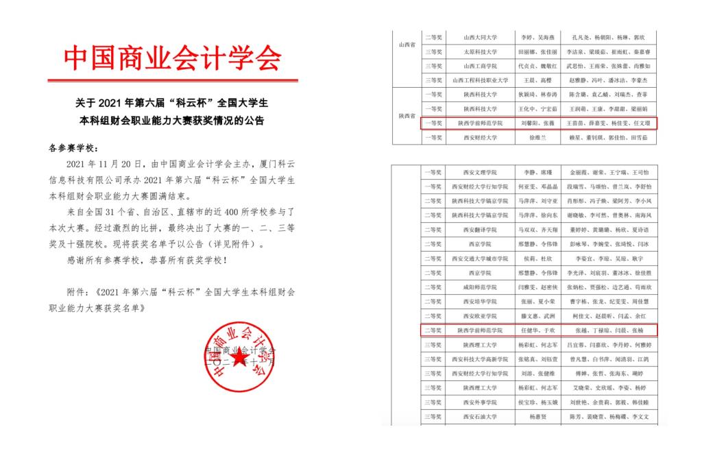 2021年11月20日,由中国商业会计学会主办的第六届“科云杯”全国大学生财会职业能力国赛圆满落下帷幕。云博yunbo(中国)经济与管理学院本科组两支参赛队伍分别荣获国赛一等奖和二等奖,高职组两支参赛队伍荣获国赛二等奖和三等奖,这是云博yunbo(中国)参加本项赛事以来获奖人数最多的一次。