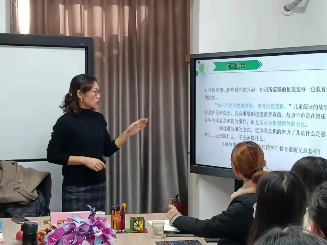 同学们以“为什么要讲故事”为切入点,思考“讲什么故事,如何讲故事”展开了激烈的讨论,通过大家的热烈讨论与老师的精彩讲解,同学们对于“如何挑选一个合适的故事”以及“怎样讲好一个故事”都有了进一步的了解。王云老师还给同学们分享了许多优质的绘本资源,并以《魔法亲亲》的故事为例,进行了详细地讲解与示范。对于同学们提出的一些关于讲故事过程中的思考和困惑,王云老师都耐心地为同学们一一解答。