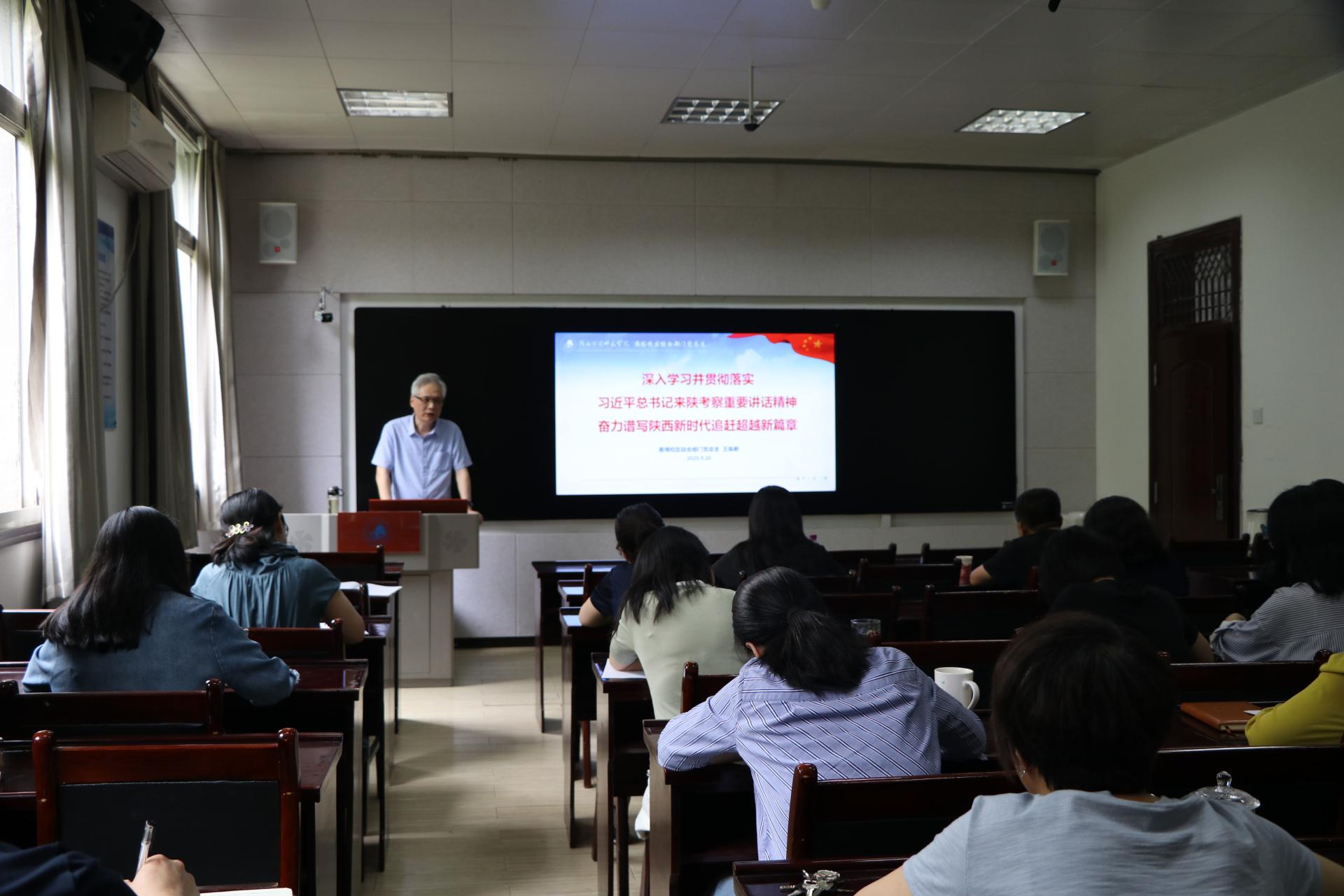 王奂新在讲课中传达了校党委《关于学习宣传贯彻习近平总书记来陕考察重要讲话精神的通知》(陕师院党〔2020〕10 号),紧紧围绕习近平总书记对陕西发展提出的总体目标和五项要求,对照总书记2015年对陕西工作提出的“五个扎实”要求,结合学校和党总支工作实际,谈了个人的学习感想与体会。